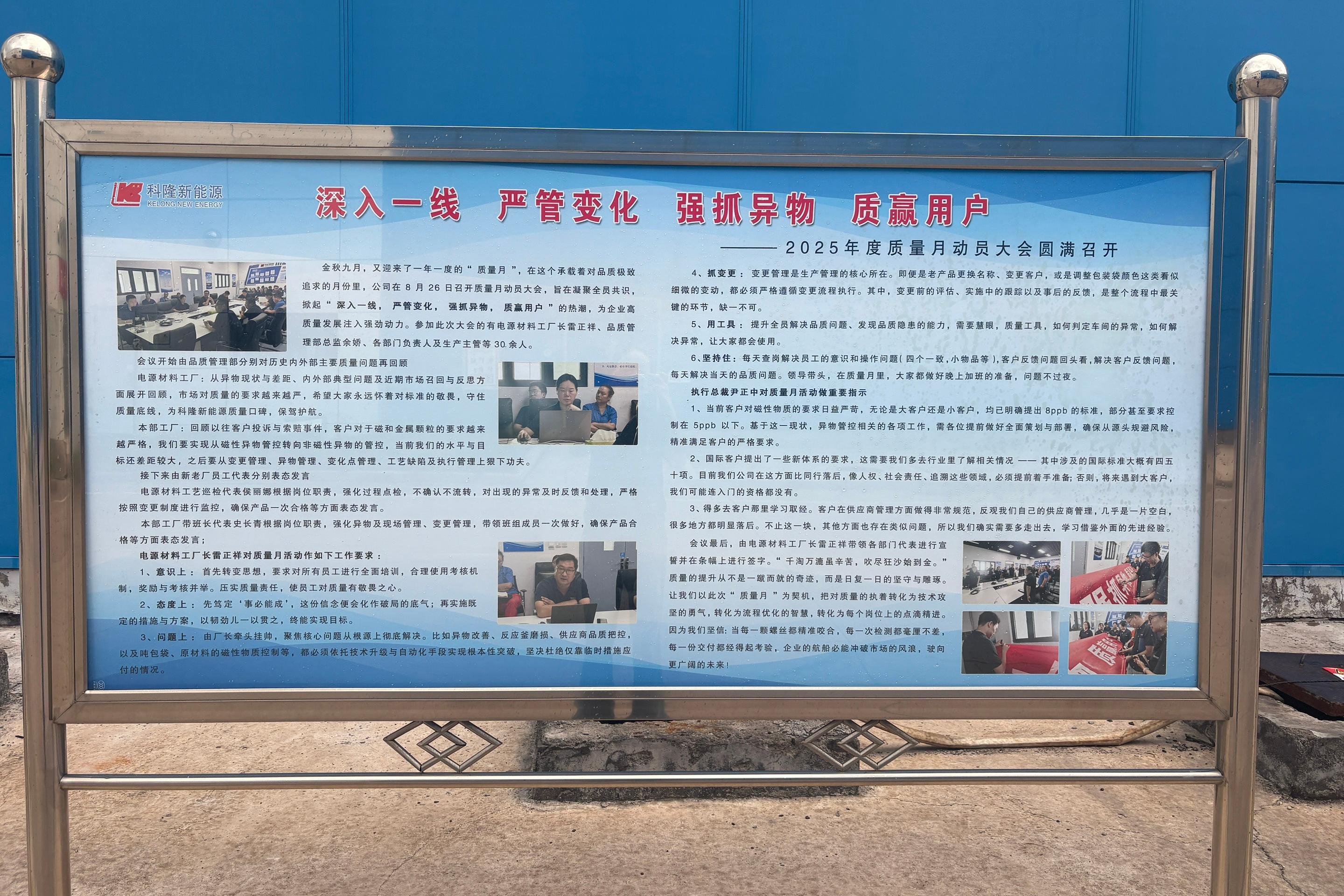 8月26日,科隆新能源召开2025年质量月活动动员大会。会议全面分析历史内外部质量问题,并对质量月各项工作进行系统部署。同时,公司通过宣传横幅、车间看板等多渠道对质量月重点活动进行宣传,将质量先行的意识传递至每一个岗位、每一位员工,为后续活动开展奠定了坚实的文化基础。